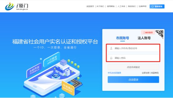 手机号或身份证号码进行注册,如已有i厦门账户的直接用i厦门账户登录