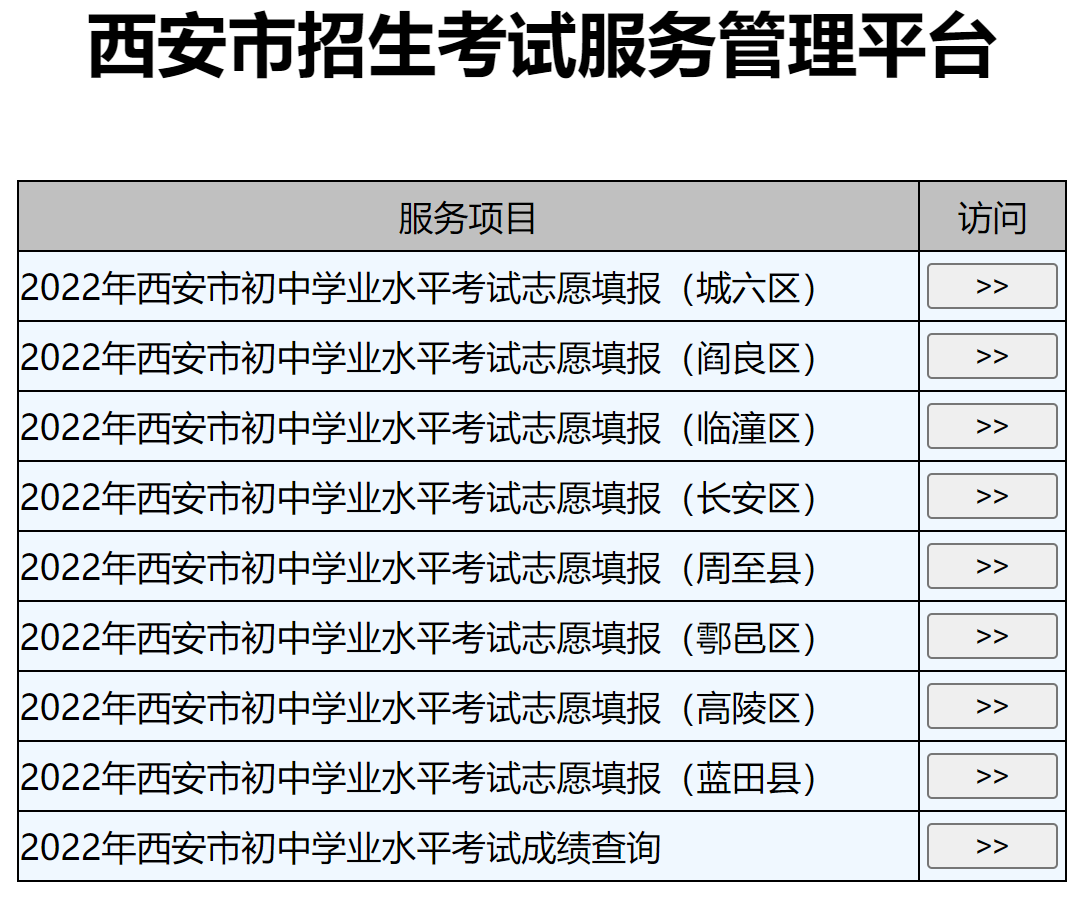 2、点击【西安市招生考试服务管理平台】进入后找得所在区县进行志愿录取查询