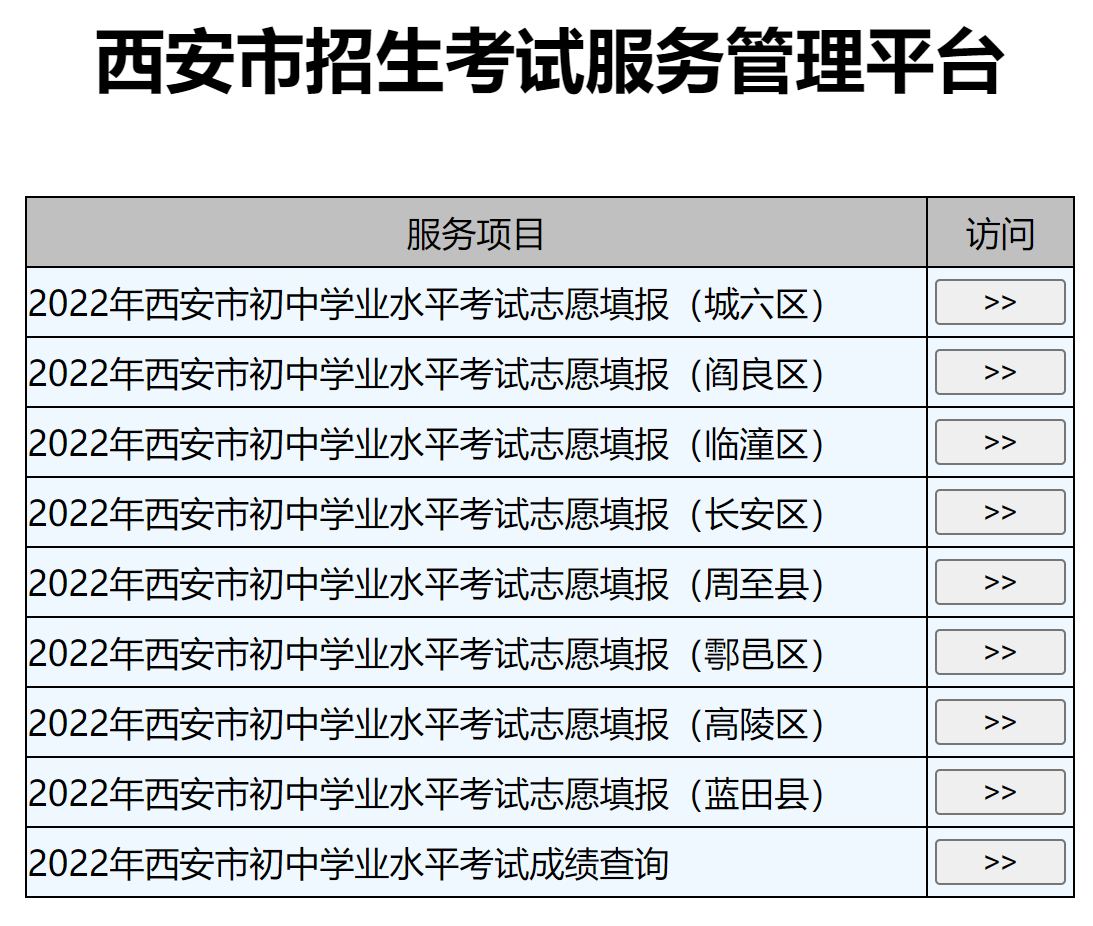 2、点击【西安市招生考试服务管理平台】进入后找得所在区县进行志愿录取查询