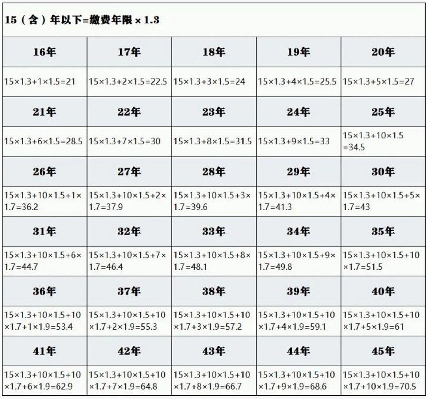 ➤对15年(含)以下的部分,每满1年,月增加1.3元;