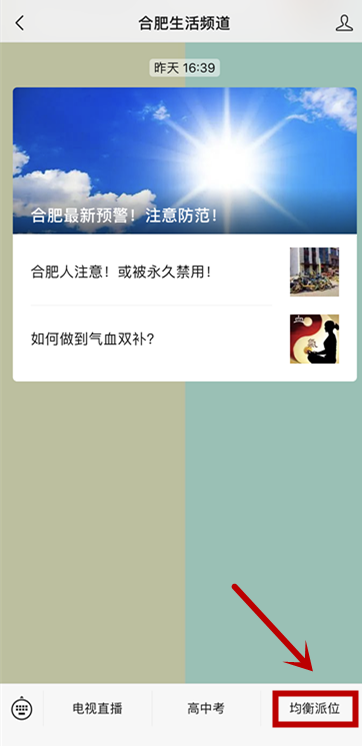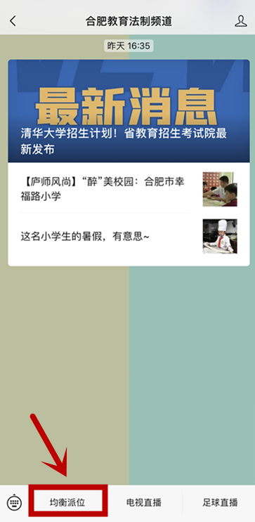 或者,手机或电脑端直接打开微信应用软件,搜索合肥市广播电视台合肥新闻频道、生活频道 、教育法制频道微信公众号,点击菜单栏“均衡派位”,即可收看。
