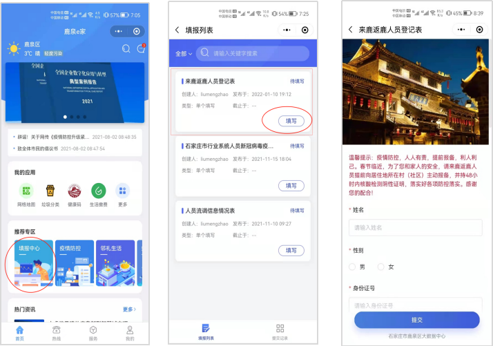 微信搜索“鹿泉E家”小程序,点击进入。在“鹿泉E家”小程序推荐专区中,找到“填报中心”,点击进入。如首次登录小程序,需按照提示进行登录。进入填报中心后,点击“来鹿返鹿人员登记表”中的“填写”按钮,进行信息登记。