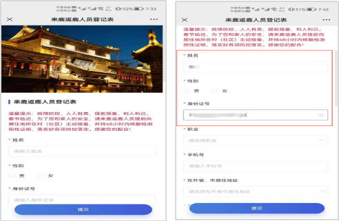 1.通过扫描二维码进行信息登记:使用微信或支付宝,扫描以下二维码,进入来鹿返鹿人员登记表登记页面。