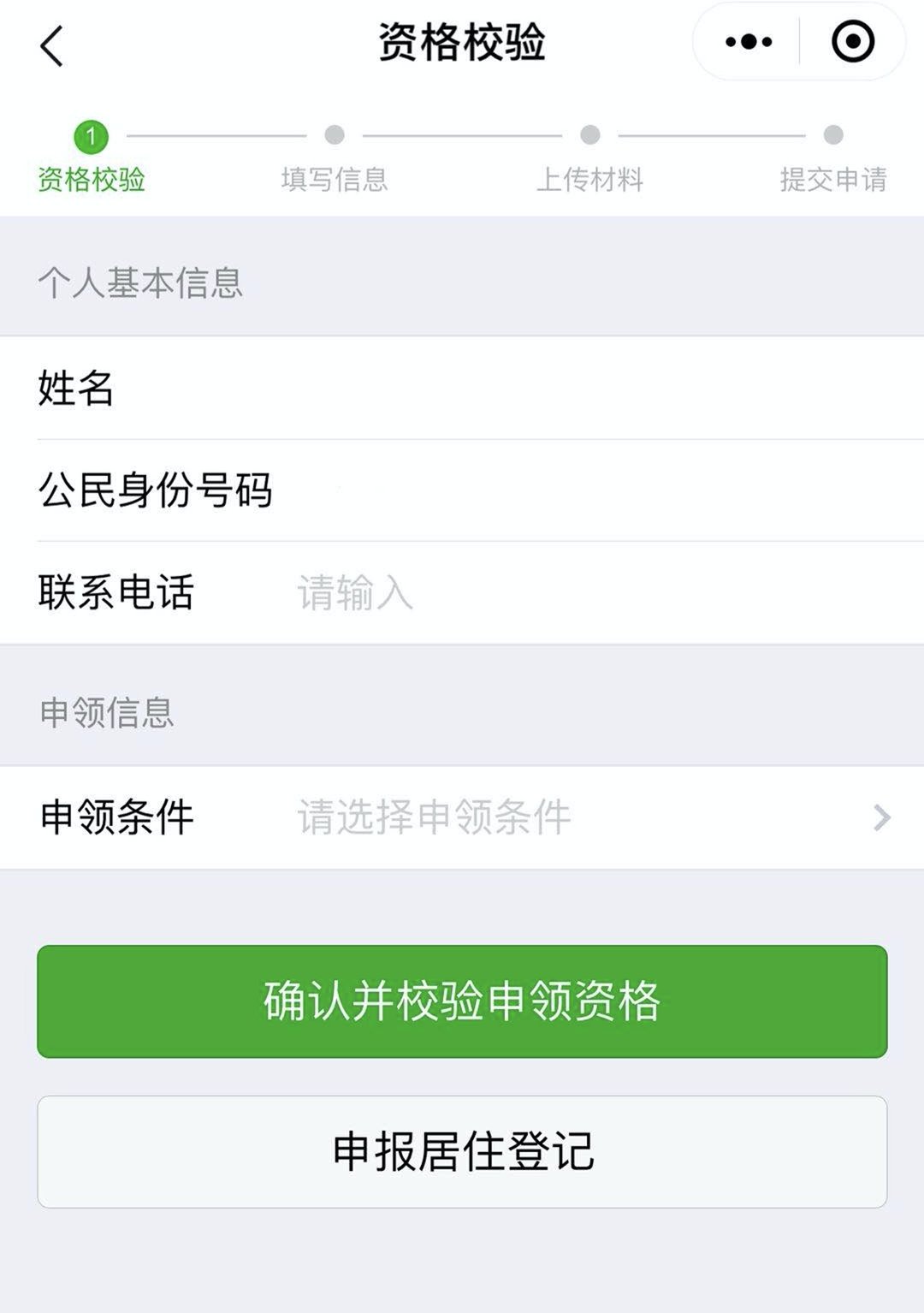 第四步:输入个人信息后根据自身情况选择申领条件,点击确认并校验申领资格。