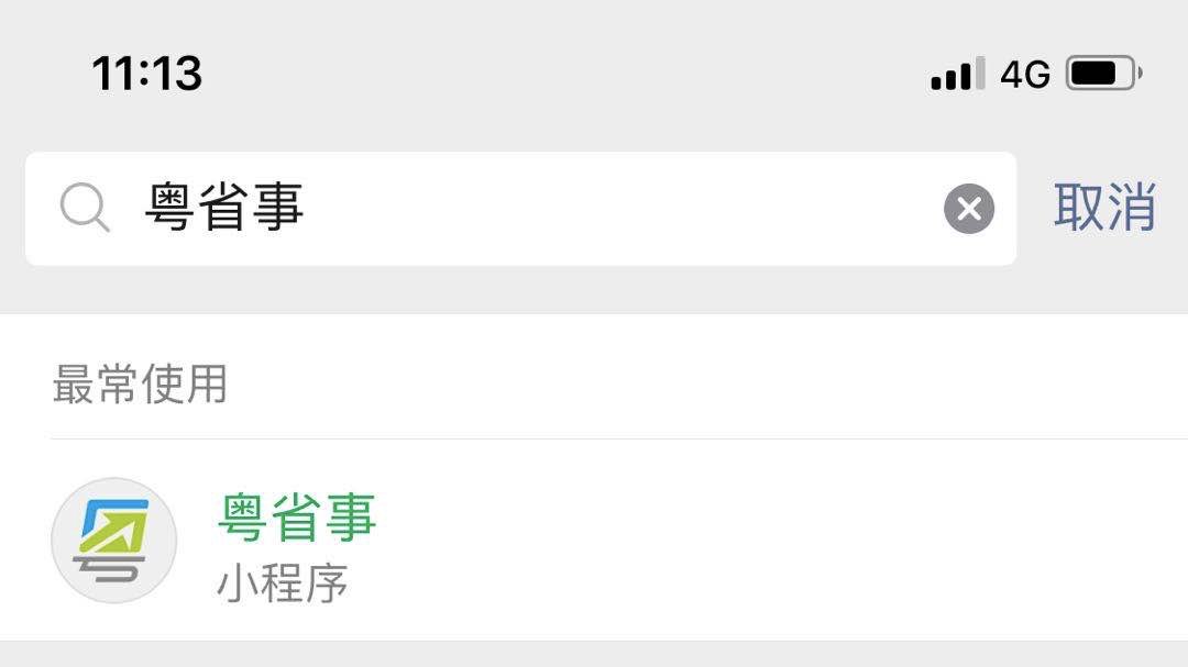 第一步:手机端在微信中查找栏内输入“粤省事”找到小程序并打开登录。