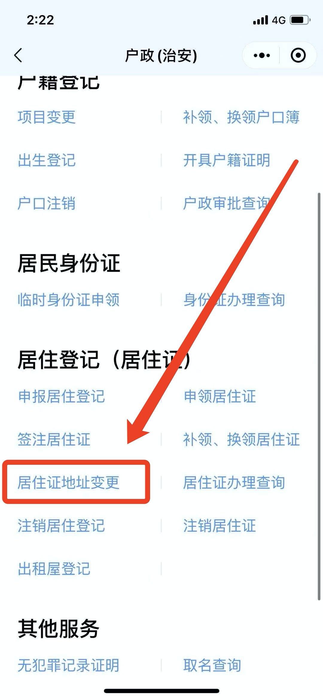 第二步:选择居住登记(居住证)板块的“居住地址变更”。