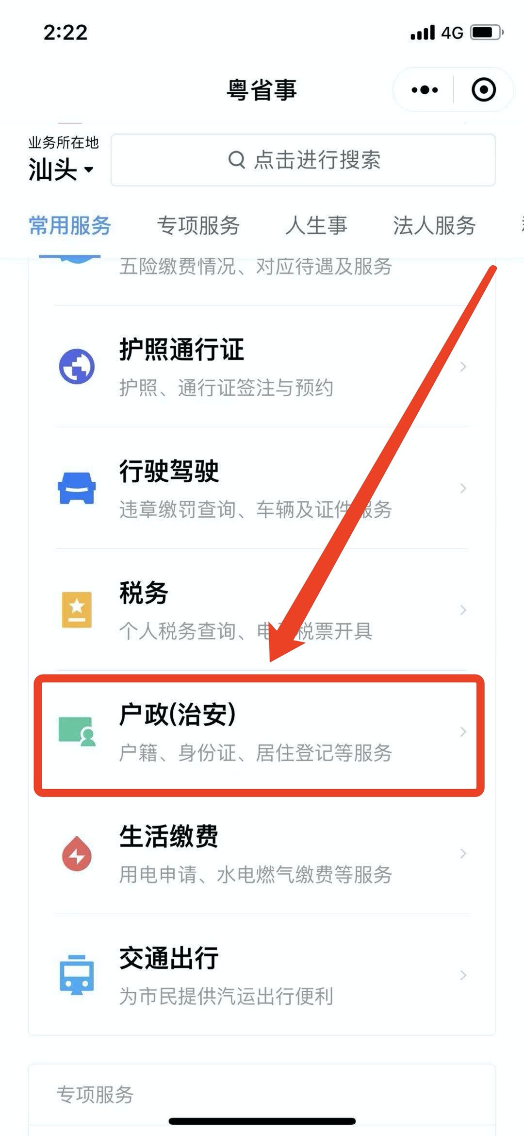 第一步:手机端进入“粤省事”办事小程序,登陆个人账号,下滑至“户政(治安)”点击进入。