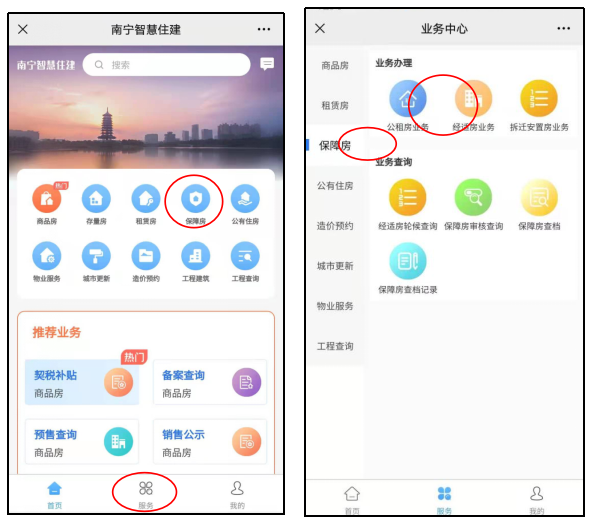 1.点击“保障房”或者“服务”菜单,进入“业务中心”页面,选择“公租房业务”。