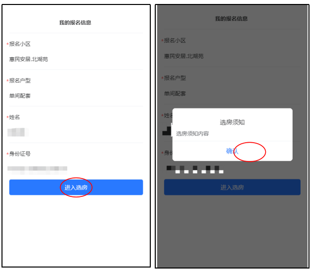3.确认“报名信息”,点击“进入选房”阅读“选房须知”,点击“确认”。