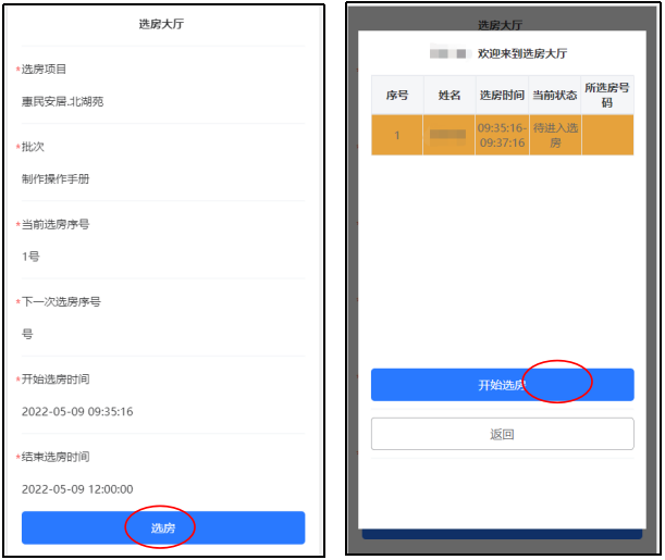 4.点击“选房”进入选房大厅,等待选房,当等到自己的选房时间后,点击“开始选房”进入选房。