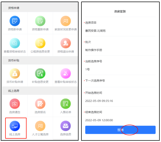 2.点击“线上选房”按钮,进入公租房线上选房,第一次进入显示选房签到,点击“签到”。