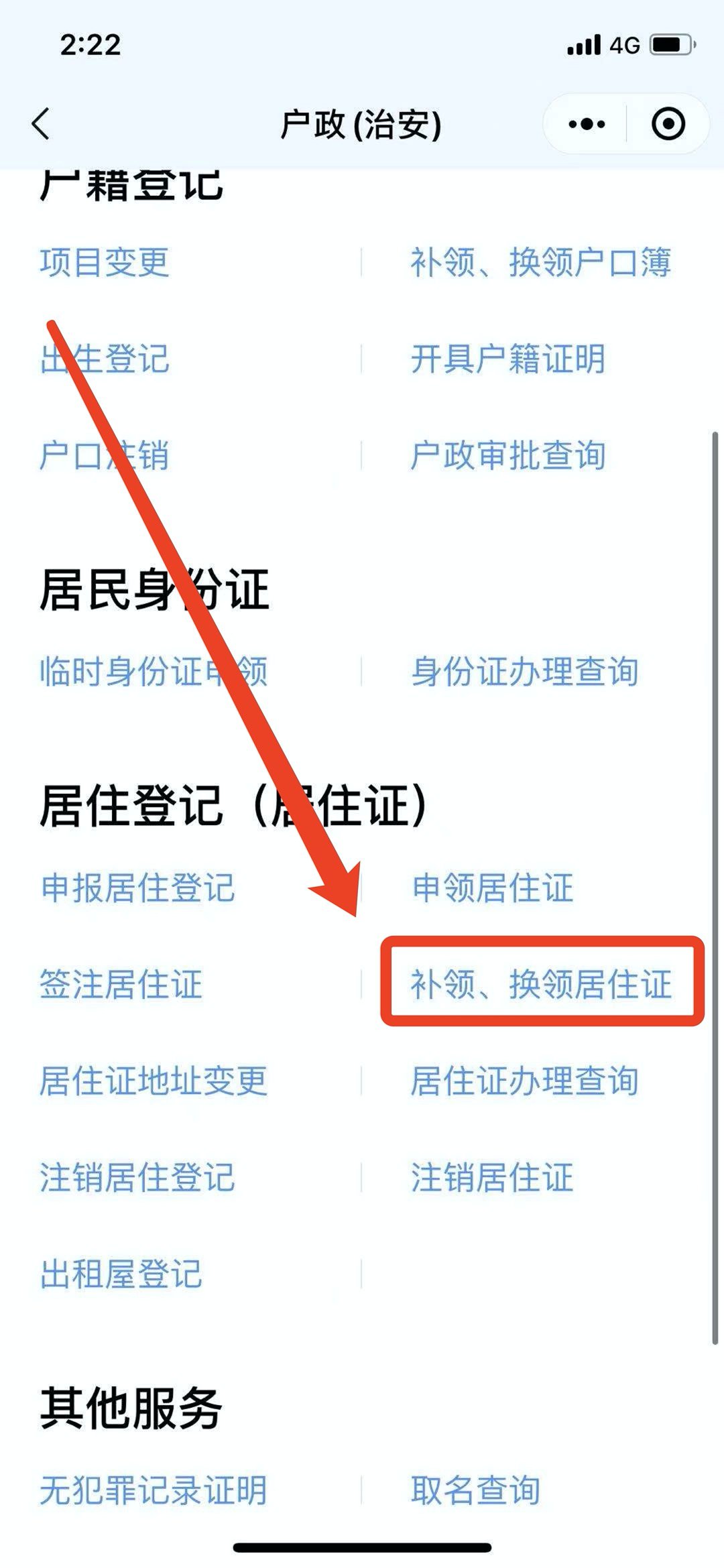 第二步:在居住登记(居住证)一栏选择补领、换领居住证。