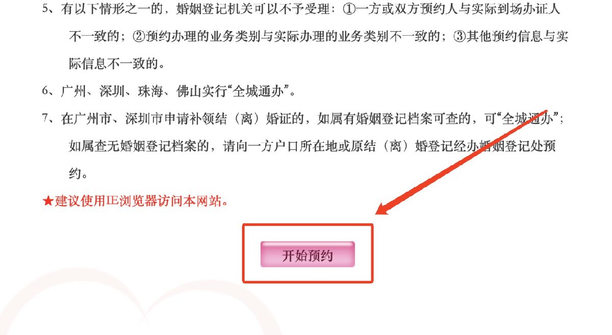 1.点击上方链接进入“广东民政婚姻登记网上预约系统”,点击页面下方粉色“开始预约”。