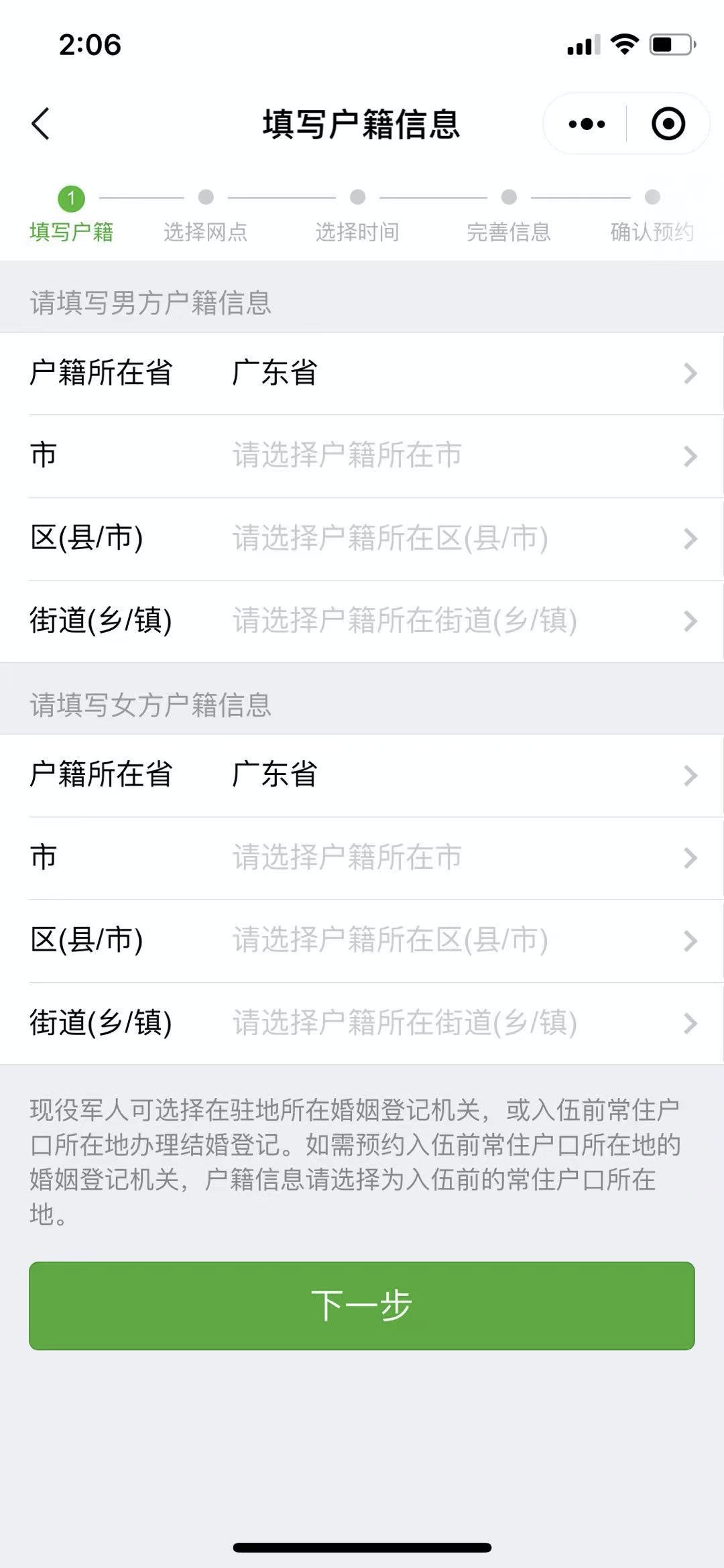 5.进入页面后填写双方个人信息点击【下一步】,根据流程提示选择网点、时间、完善信息即可预约成功。