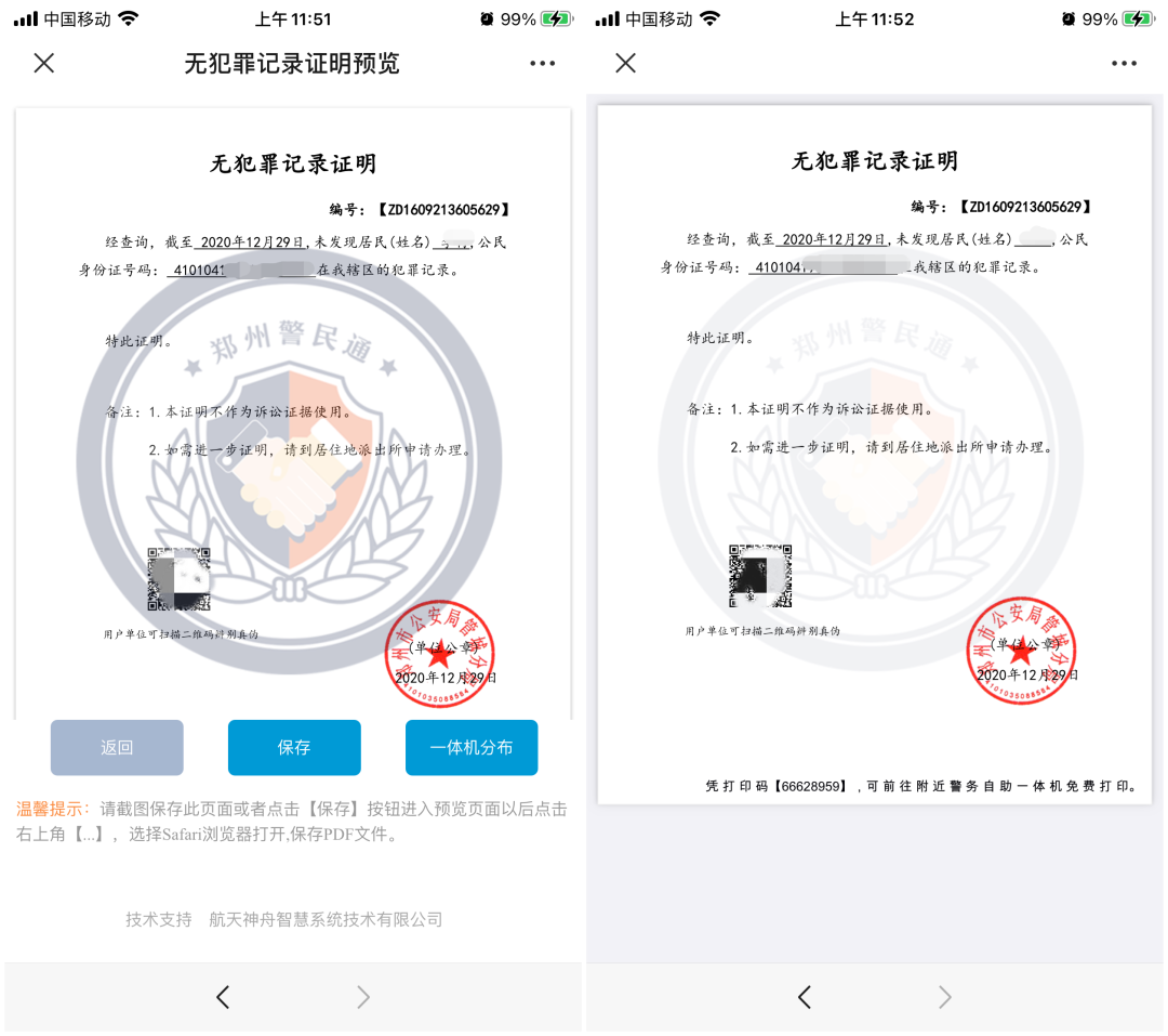 03 认证成功后,可在线预览“无犯罪记录证明”,如需保存,可截图保存此界面或者点击【保存】按钮;