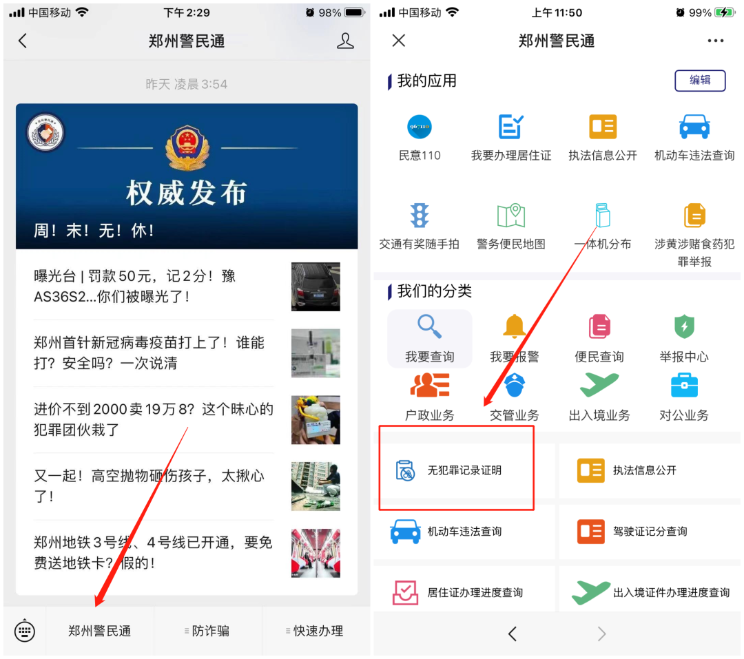 郑州警民通无违法犯罪证明办理系统重新研发,目前暂无法线上办理,新版“无犯罪证明”服务上线时我们将在第一时间通知。