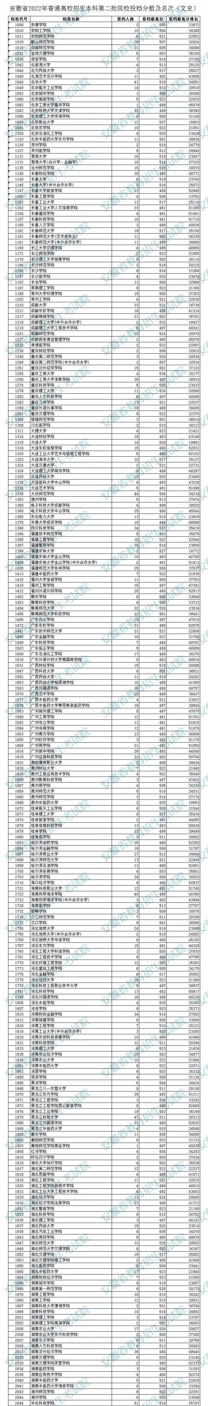 安徽省2022年普通高校招生本科第二批院校投档分数及名次(文史)