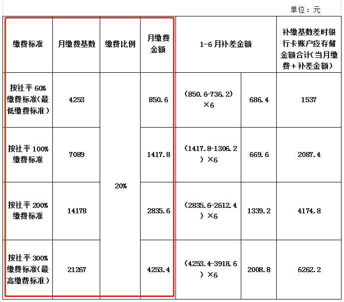 1.本年度内需变更缴费标准的个体灵活就业参保人员,可按照上表4253元至21267元的缴费标准作为参考,将当月应缴费金额以及1-6月补差金额一并存入申报银行卡账户内。