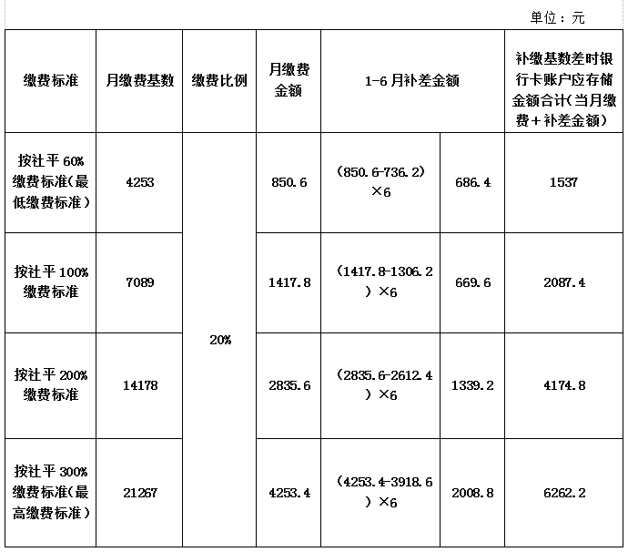 1.本年度内需变更缴费标准的个体灵活就业参保人员,可按照上表4253元至21267元的缴费标准作为参考,将当月应缴费金额以及1-6月补差金额一并存入申报银行卡账户内。