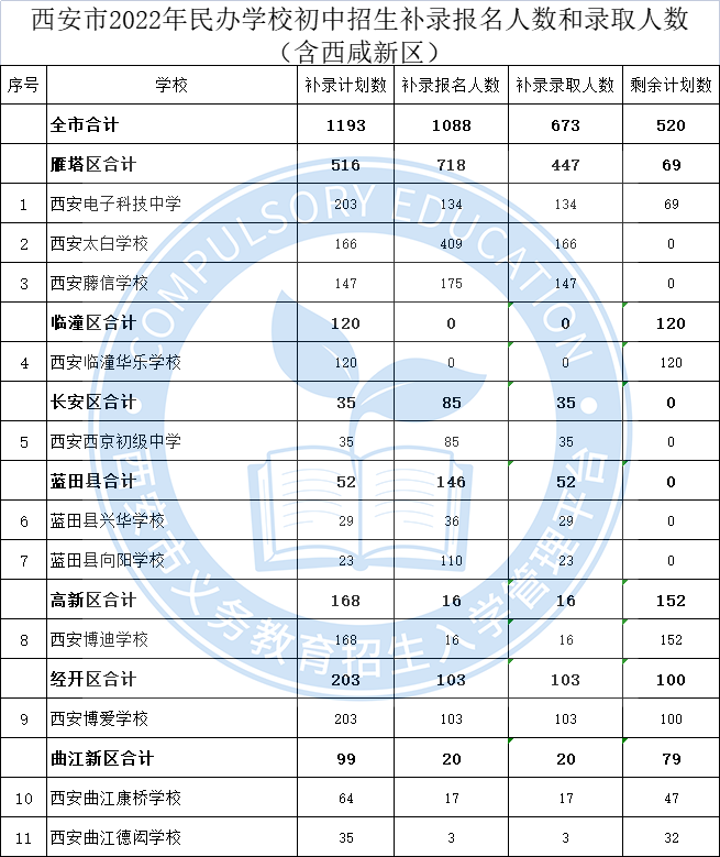 西安市2022年民办学校初中招生补录报名人数和录取人数(含西咸新区):
