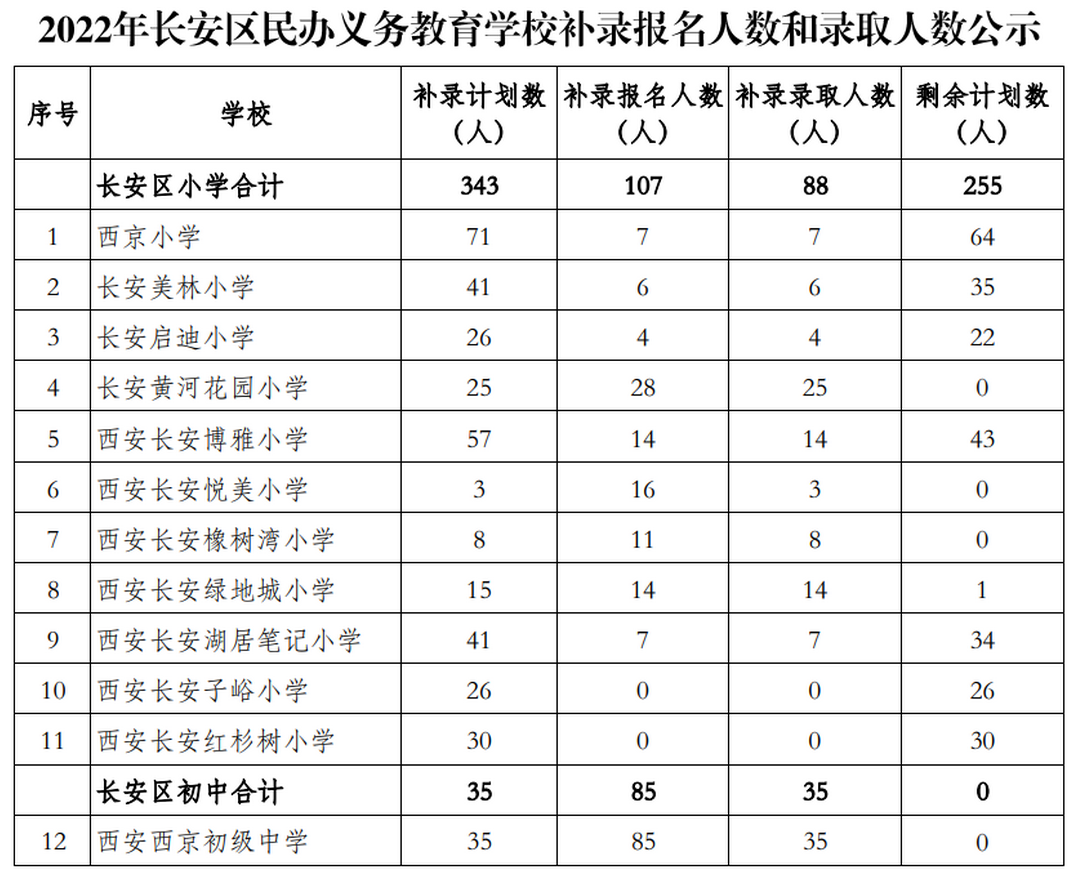 2022西安长安区民办学校补录报名人数和录取人数公示
