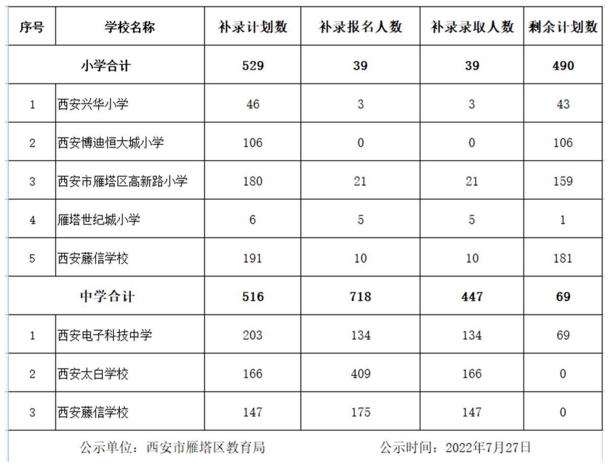 2022西安雁塔区民办学校补录报名人数和录取人数公布