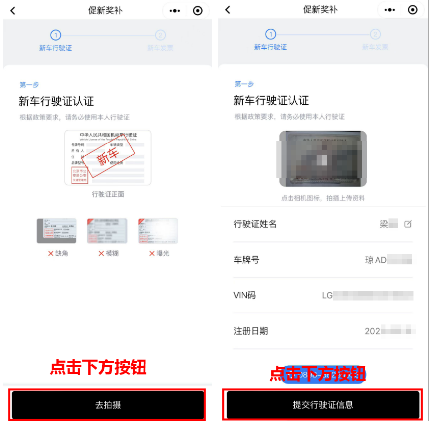 点击【新车使用补贴】,自动跳转行驶证认证页面,点击【去拍摄】可选择直接拍摄或者从相册上传。