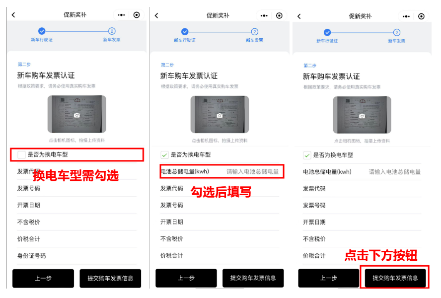 核对系统识别的信息,可手动修改,确认无误后点击【提交购车发票信息】,即可完成。如果未点击【提交购车发票信息】,再次申报时,将自动跳转此页面。