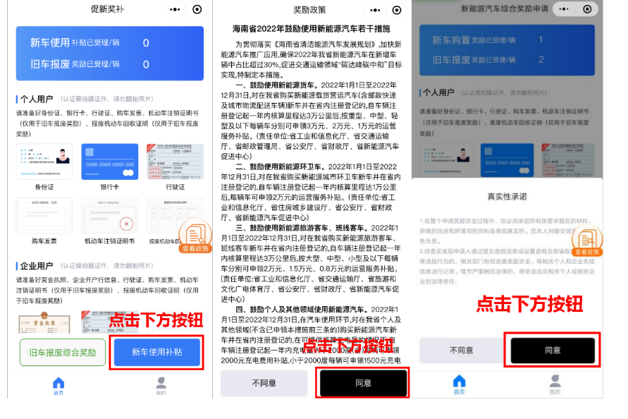 点击【新车使用补贴】,进入补贴申请流程,阅读有关信息,并承诺提供的申报材料真实有效。