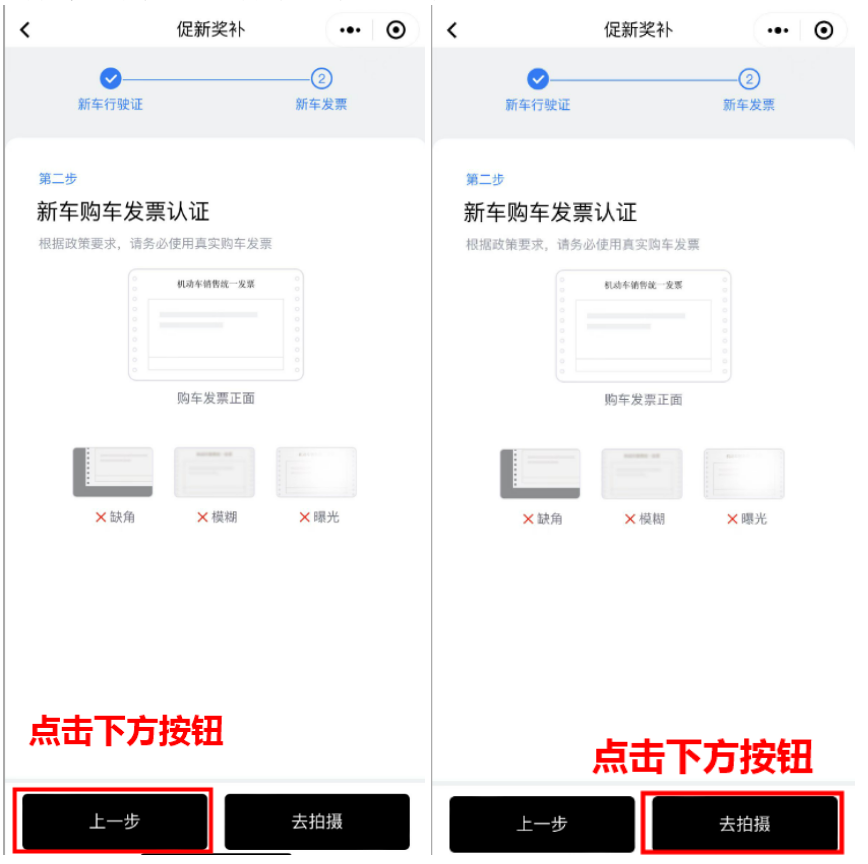 点击【去拍摄】可选择直接拍摄或者从相册上传。必须使用真实有效的机动车销售统一发票。