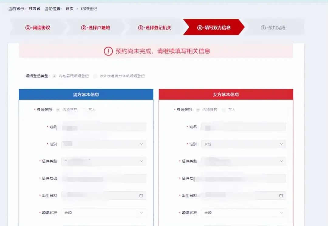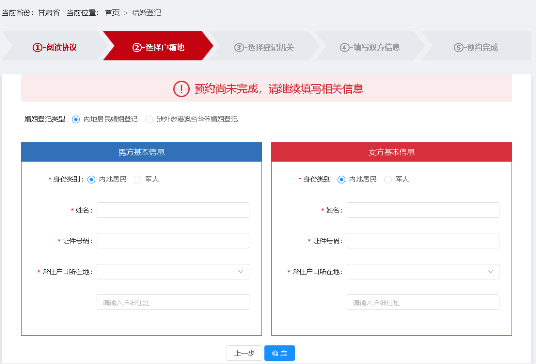 ⑥填写双方信息,并上传证件,点击确认即可完成预约(其他登记可依照结婚登记流程进行预约);