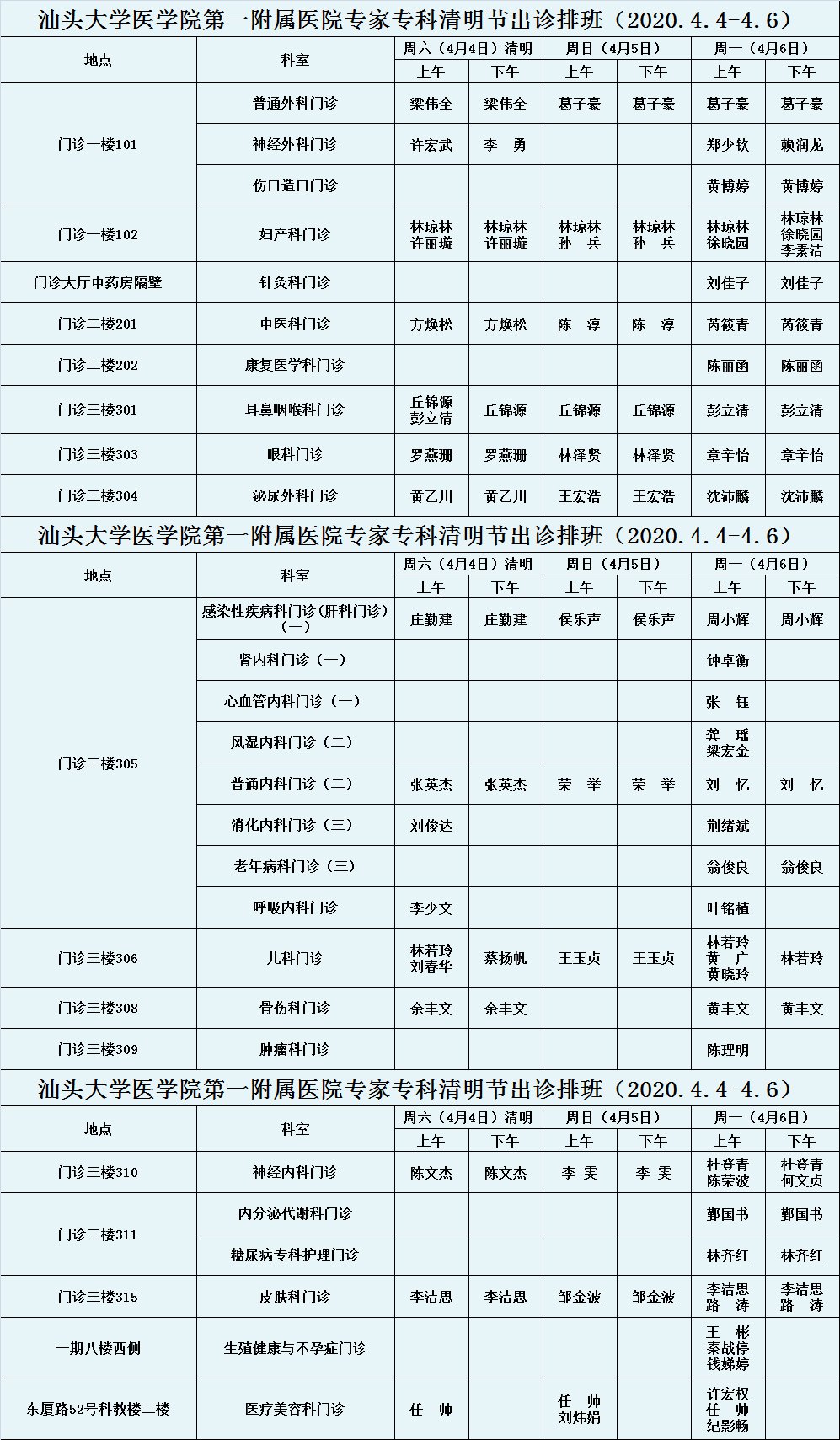 2020年4月4日至4月6日清明节放假调休,期间我院将继续坚持“无假日医院”服务,门诊照常开诊。