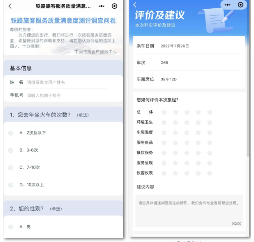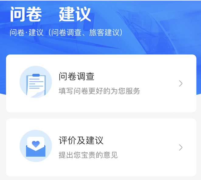 还可以填写铁路旅客服务质量满意度,测评调查问卷或对本次列车进行评价及建议
