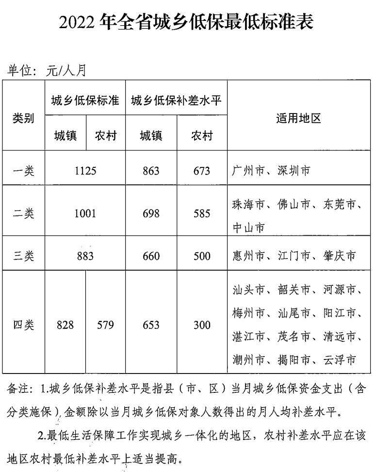 2022广东省全省城乡低保最低标准的通知