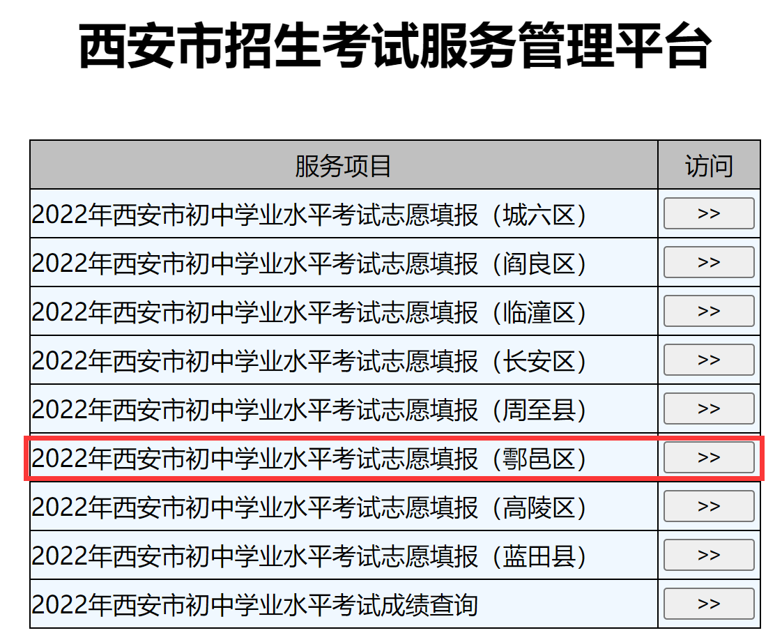 2、点击进入【西安市招生考试服务管理平台】,点击鄠邑区志愿填报入口;