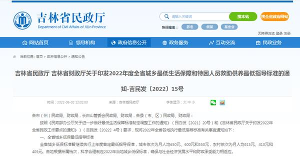 吉林省民政厅 吉林省财政厅关于印发2022年度全省城乡最低生活保障和特困人员救助供养最低指导标准的通知 吉民发〔2022〕15号