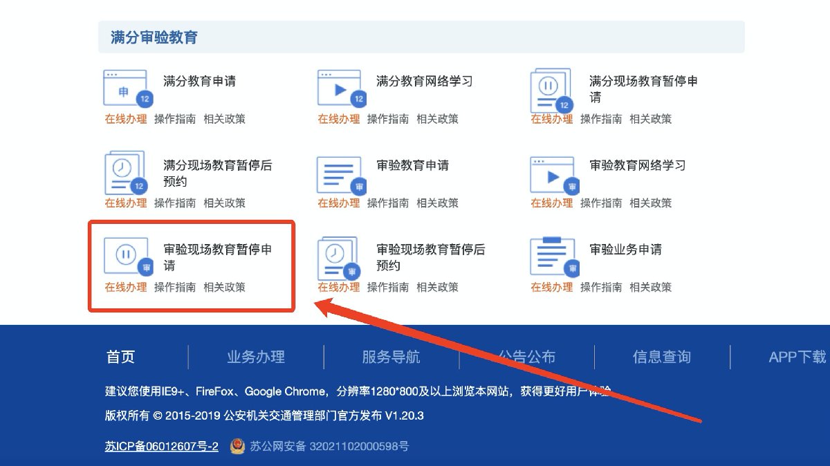 互联网注册用户在互联网登录后,已申请审验现场教育的用户可以点击【满分审验业务】→【审验现场教育暂停申请】办理该业务。