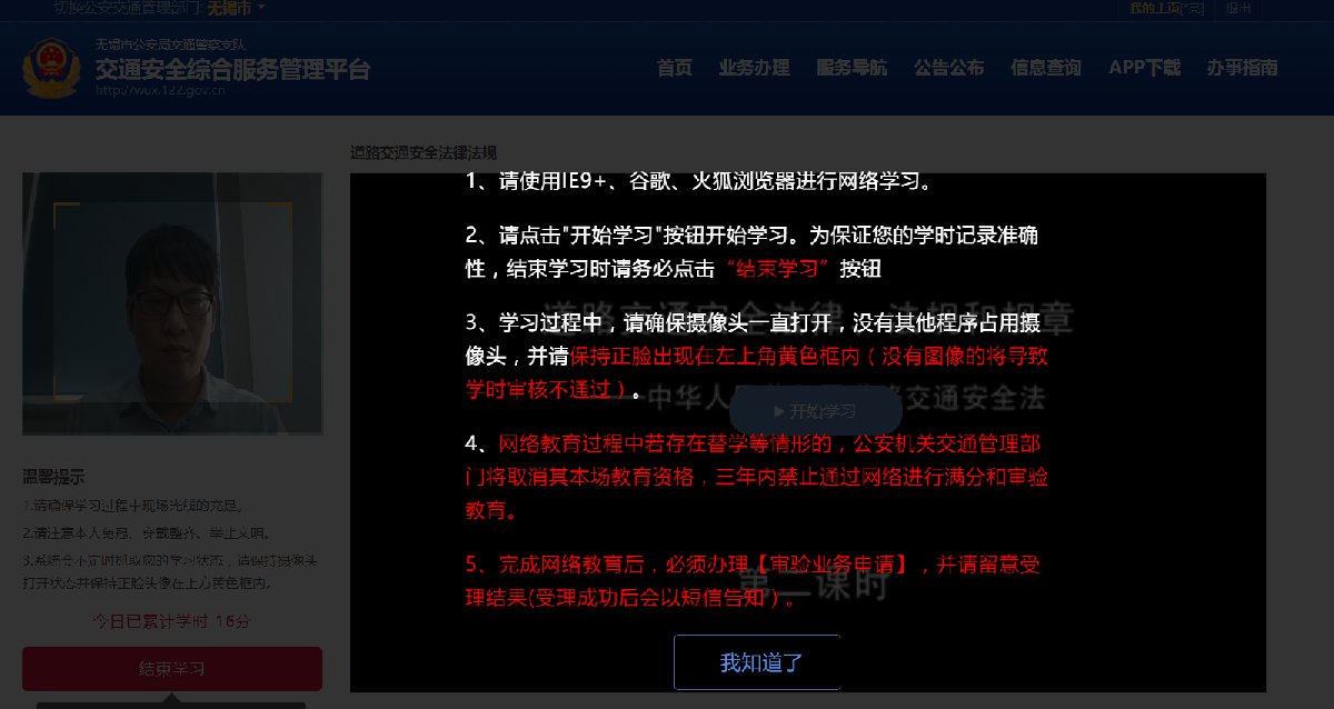 (3)学习过程中,存在替学情形的,公安机关交通管理部门将取消您教育资格,三年内禁止通过网络进行满分和审验教育。存在瞌睡、做与学习无关之事、离开等不认真学习情形的,学习记录将审核不通过,学习时间作废。