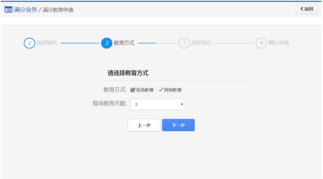 用户通过该功能可以申请 现场教育 或 现场+网络教育 方式来完成满分教育。