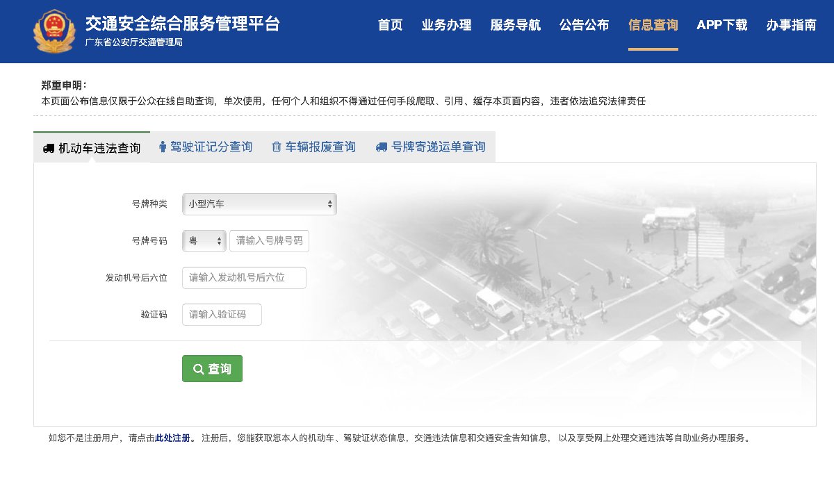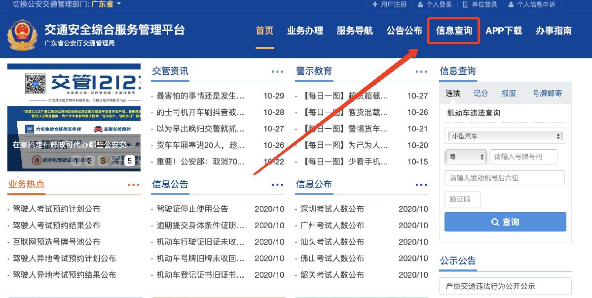 1.点击链接进入交通安全综合服务管理平台,选择上方菜单栏中的【信息查询】点击进入。