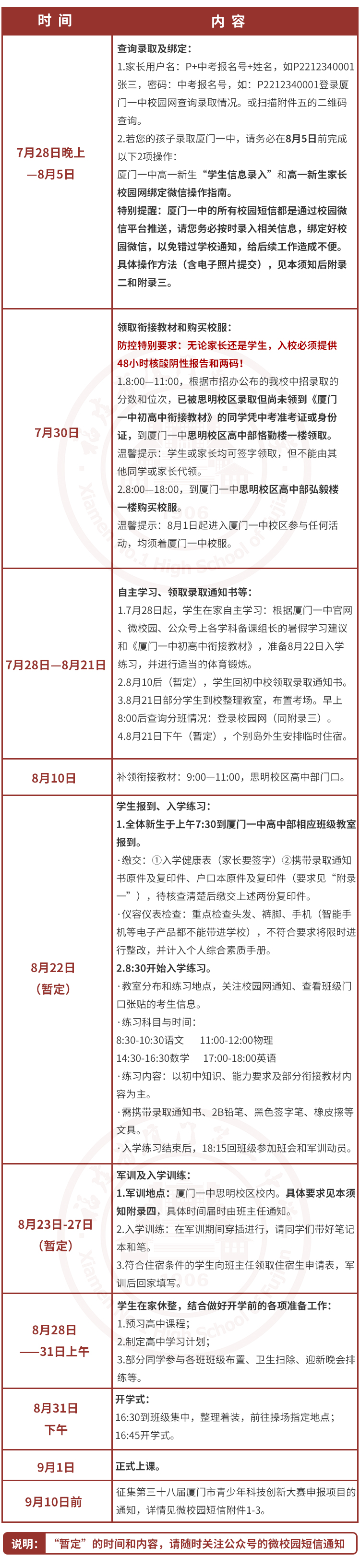 ⒉若您的孩子录取厦门一中,请务必在8月5日前完成以下2项操作:
