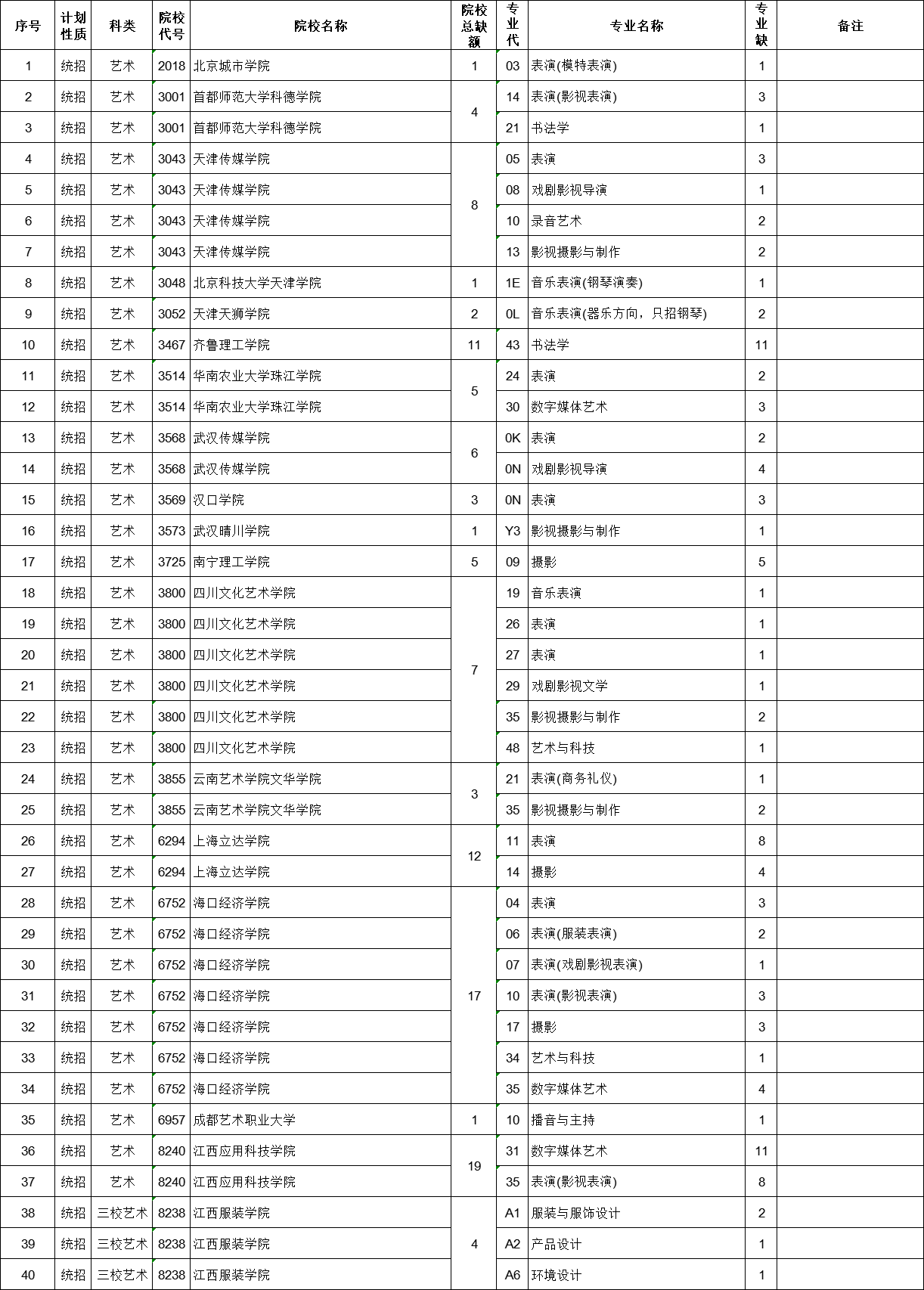 完整表格:《江西省2022年普通高校招生艺术本科单志愿(含三校艺术)缺额院校及专业统计表》