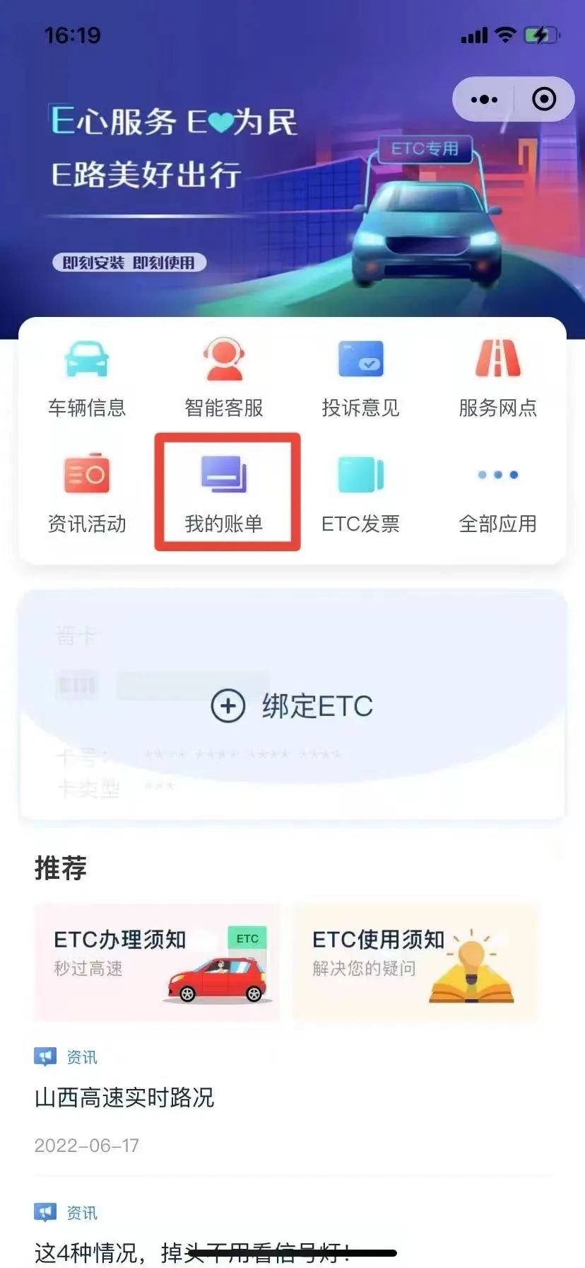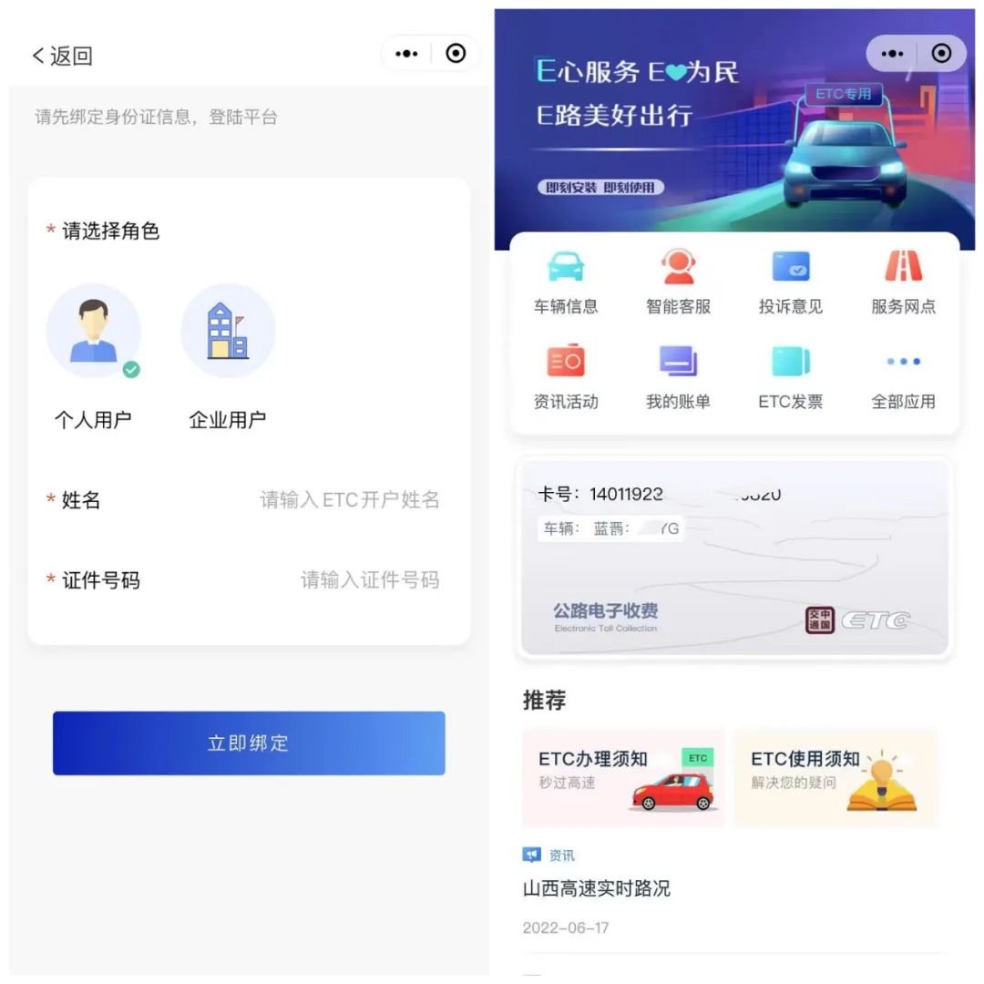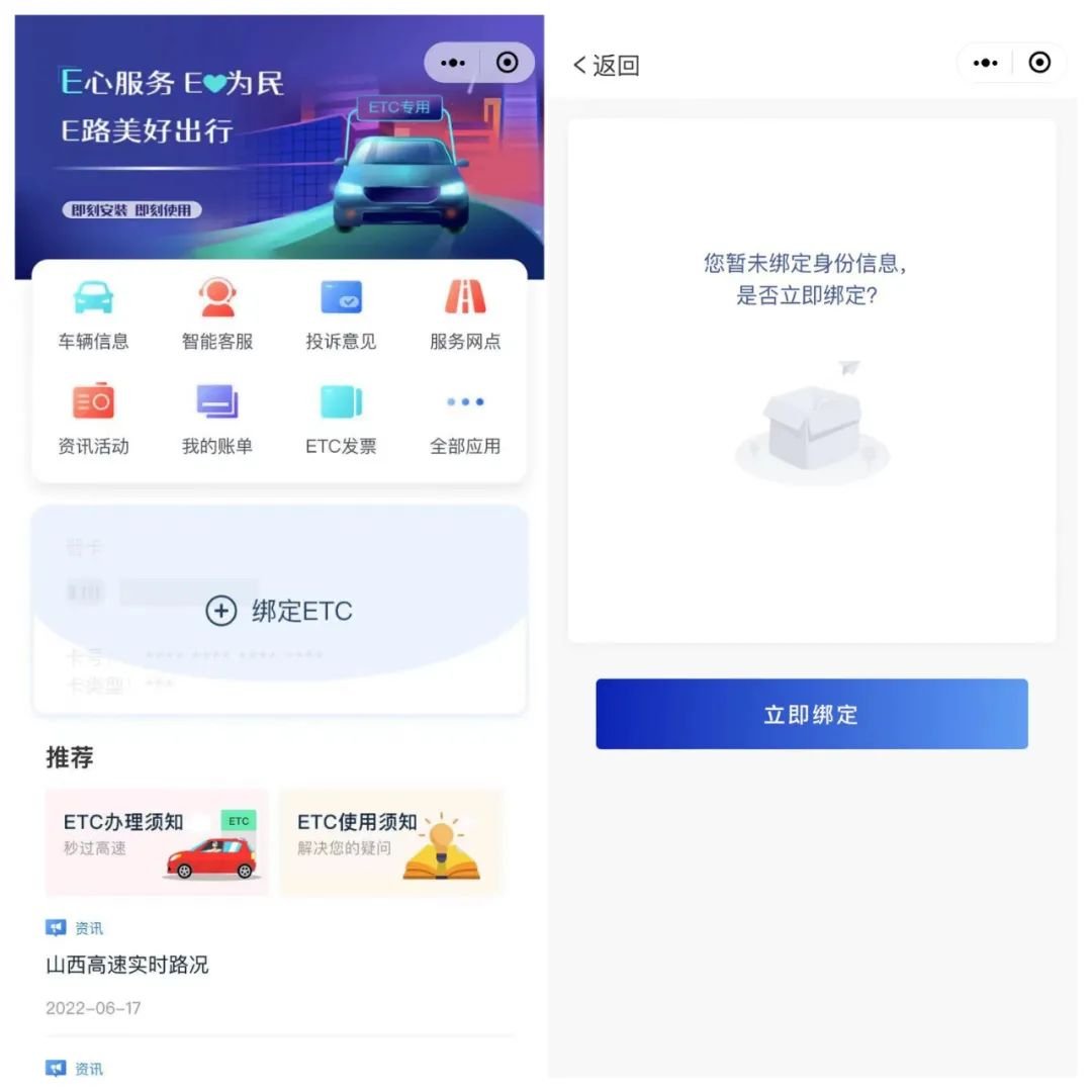 相关预留信息可通过ETC营业厅或客服热线:0351-7337793/95022进行查询。填写相应信息后,点击下方蓝色“立即绑定”按钮,成功绑定即跳转小程序首页界面。