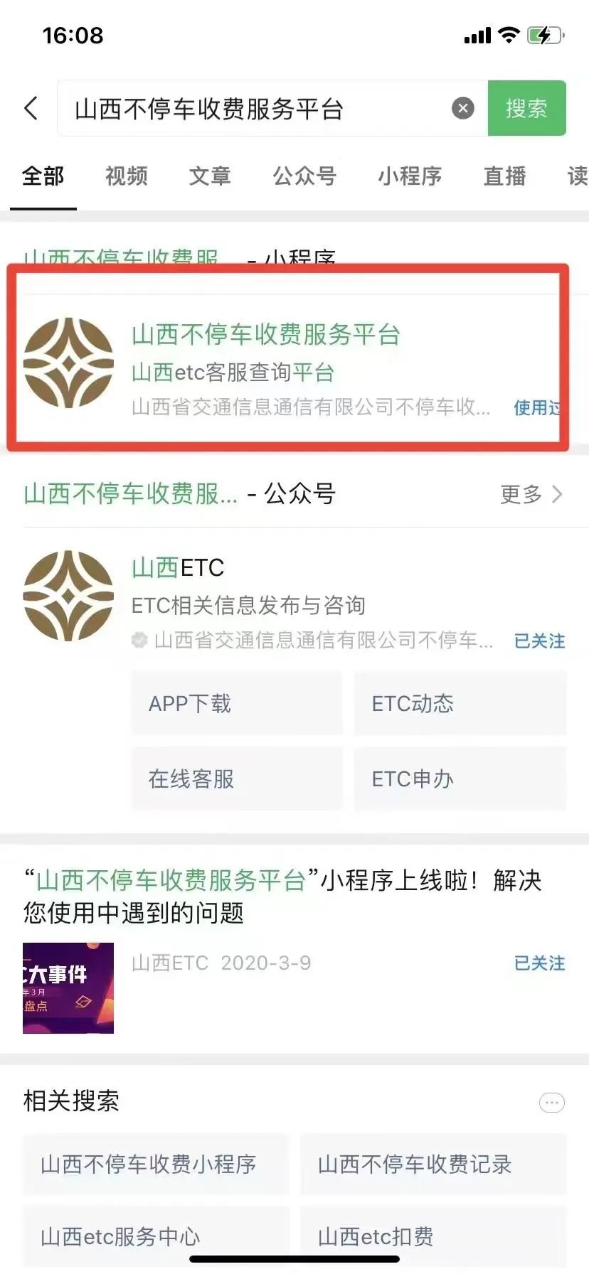 1、打开微信首页,点击顶部搜索框输入“山西不停车收费服务平台”,点击进入。