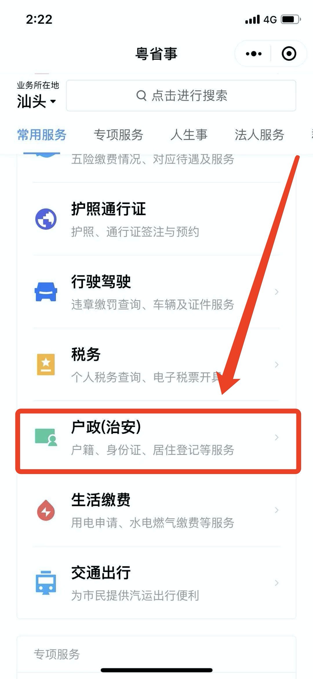 第一步:微信端进入“粤省事”小程序,下滑至户政(治安)点击进入。