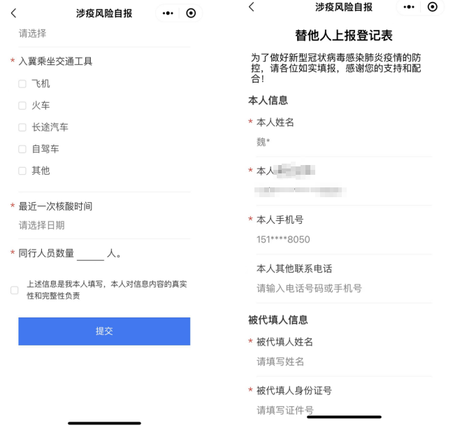 群众打开河北健康码,上滑点击“涉疫风险自报”,按页面提示填报个人相关信息或代他人填报相关信息。