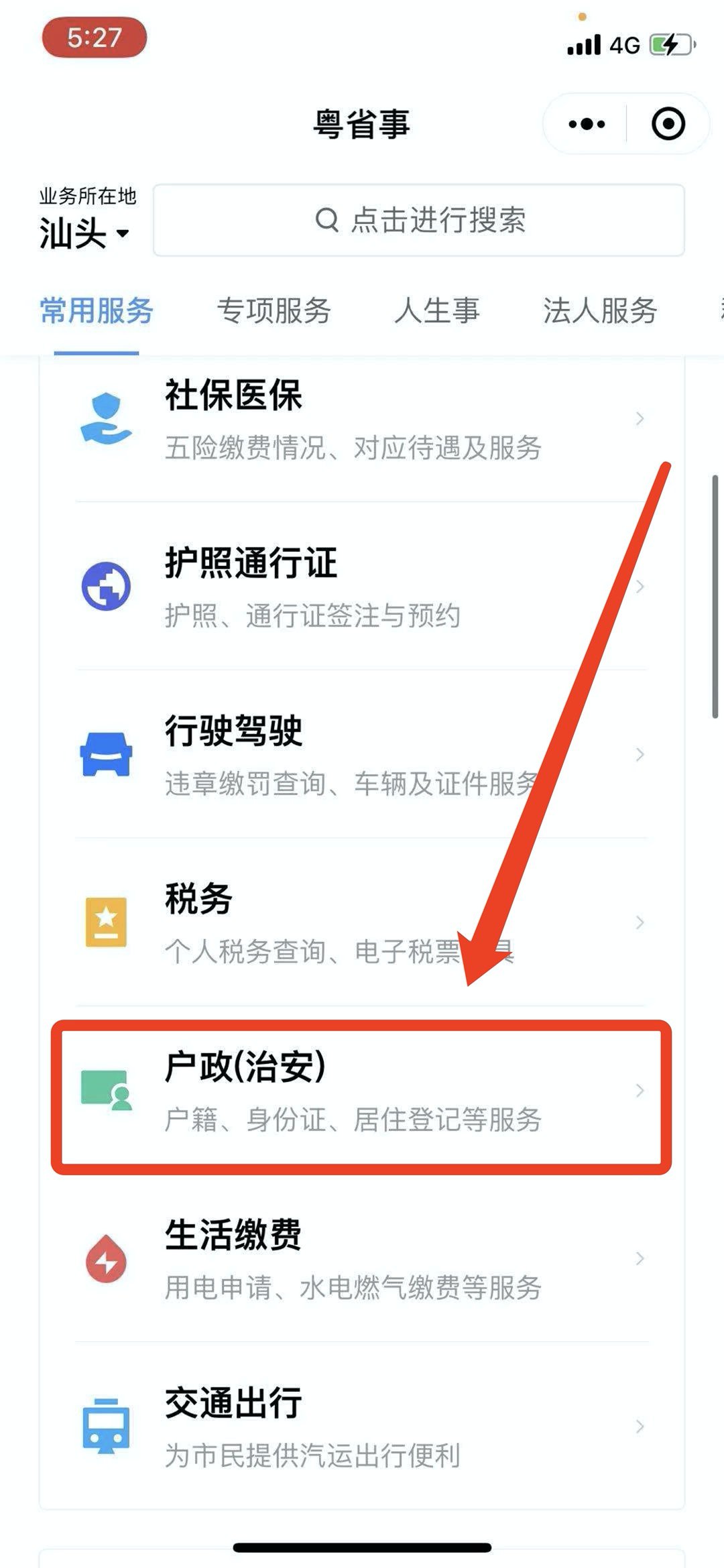 第一步:微信端进入“粤省事”小程序,登陆个人信息后下滑到“户政(治安)”点击进入。