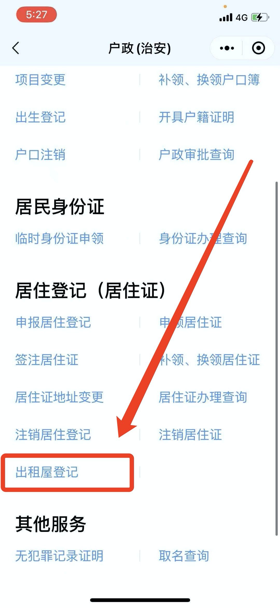 第二步:选择居住登记(居住证)板块下方到“出租屋登记”。