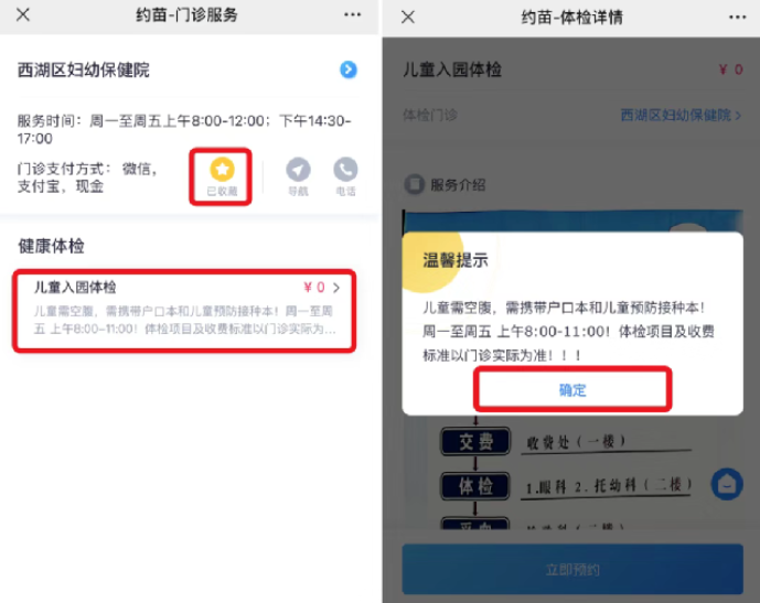 第四步:点击【儿童入园体检】,浏览温馨提示,点击确定,【立即预约】;