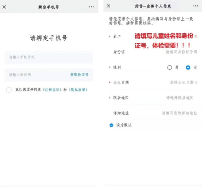 第三步:绑定手机号,完善儿童体检个人信息(儿童姓名和身份证号必须填写);